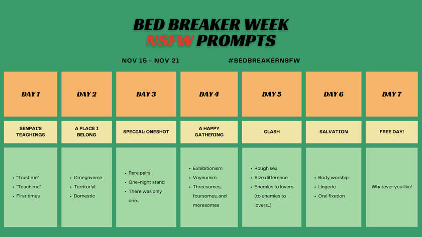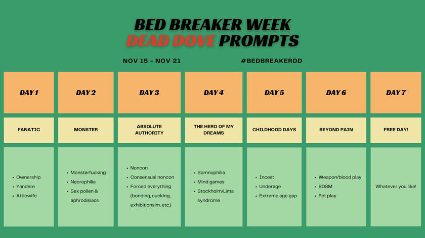For social media posts, use the following hashtags:#bedbreakernsfw for "regular" NSFW works#bedbreakerdd for "dead dove" works. See below for what content should be tagged as such.CONTENT WARNING BELOWA list of what will be considered "dead dove" for this event is as follows: